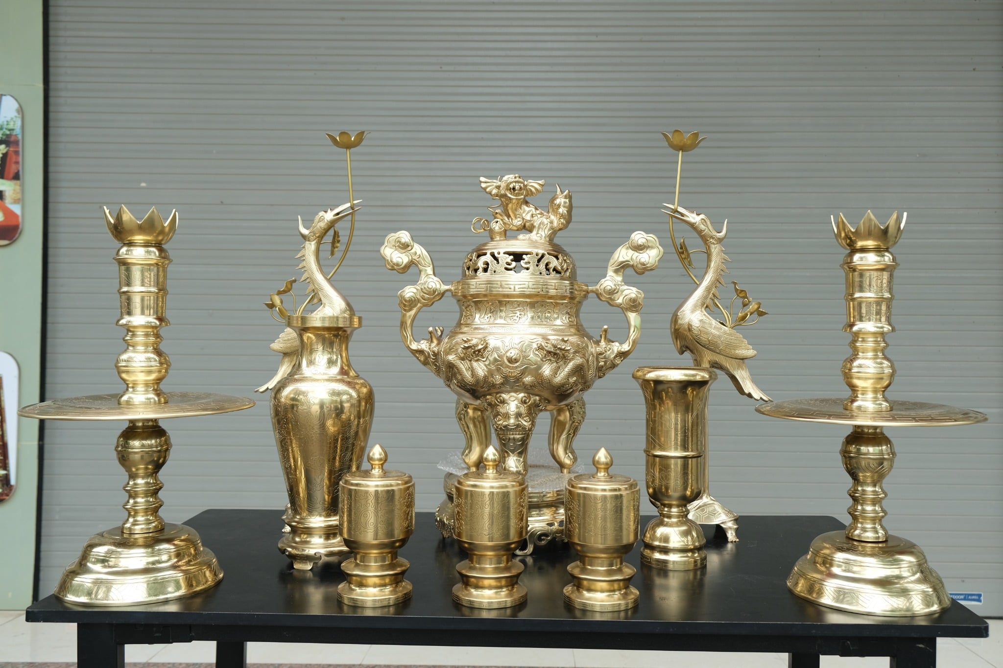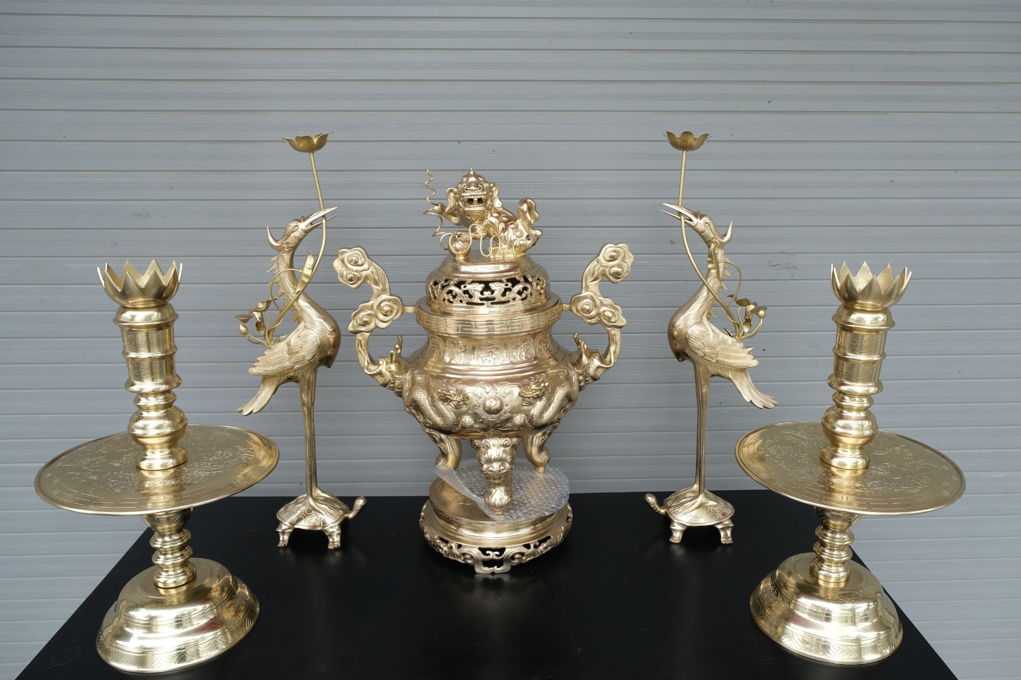 | Kích thước | - Đỉnh cao 60cm : 1 đỉnh - Hạc cao 62cm : 1 đôi - Nến cao 45cm : 1 đôi - Sen nến 5cm : 1 đôi - Lọ hoa cao 38cm : 1 đôi - Ống Hương cao 29cm : 1 chiếc - Ba đài 10 catut : 1 bộ |