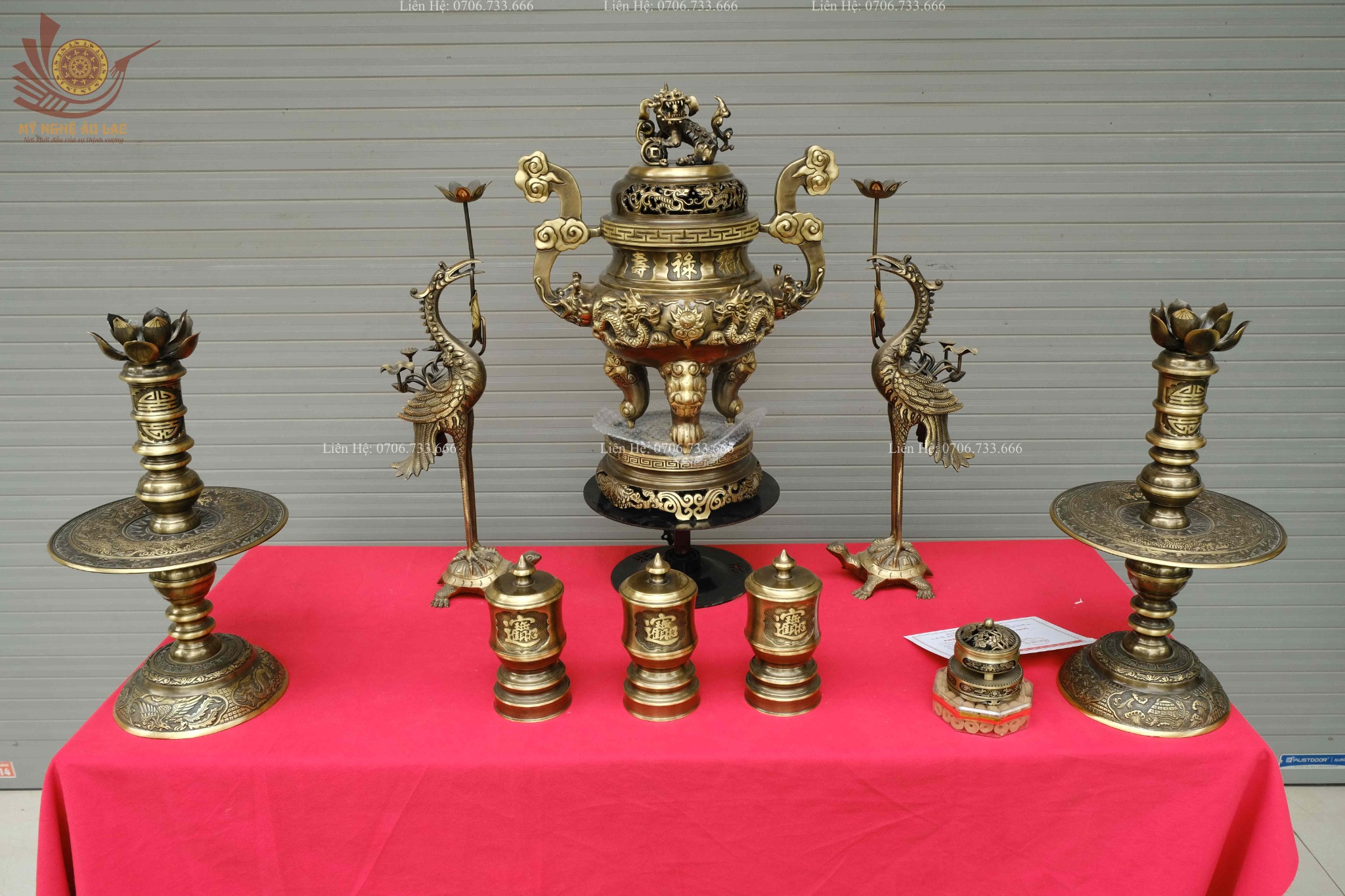 | Kích thước | - Đỉnh cao 60cm - Hạc cao 60cm - Nến cao 45cm - Sen nến 5cm - Bộ ba đài |
