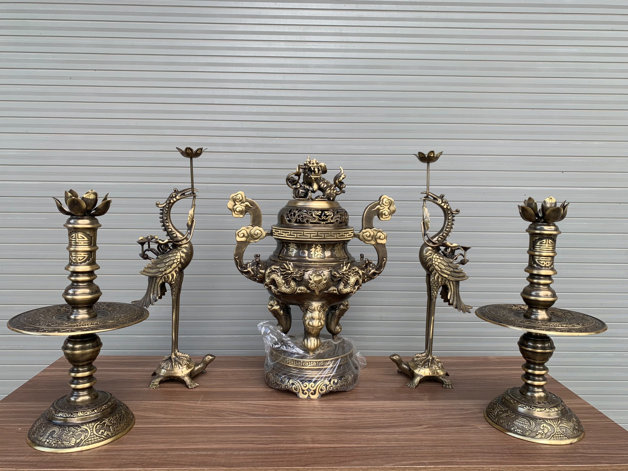 Ngũ Sự là gì? Bộ Ngũ Sự là một trong những món đồ thờ cúng không thể thiếu trên bàn thờ gia tiên, bộ ngũ sự bao gồm 5 vật phẩm chính đó là: đỉnh đồng, đôi hạc đồng thờ cúng và đôi chân nến thờ. Các họa tiết trên bộ đỉnh, chân nến, hạc đều được chạm khắc tỉ mỉ, tinh xảo. Có 3 họa tiết phổ biến trên bộ ngũ sự: song long chầu nguyệt, hoa sòi, và dơi ngâm đào. Bộ ngũ sự dâng lên ban thờ tạo nên vẻ đẹp thiêng liêng, tôn kính, và quyền lực. Bộ đỉnh chính là cái hồn uy nghi mà khi nhìn vào chúng ta sẽ thấy sự chỉnh chu, chu đáo của gia chủ dành cho gia tiên.
