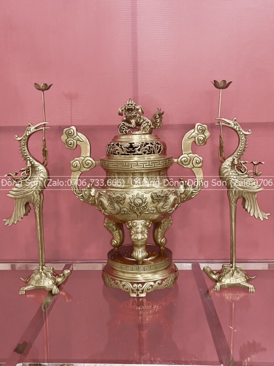 • Họa tiết trên đỉnh đồng, hạc, chân nến đều được làm bằng những kỹ thuật đúc cao. Họa tiết được chạm trổ sắc nét, thúc nổi hoàn toàn trên bề mặt. Hình ảnh con nghê trên nắp đỉnh được gắn chắc chắn với nắp đỉnh.