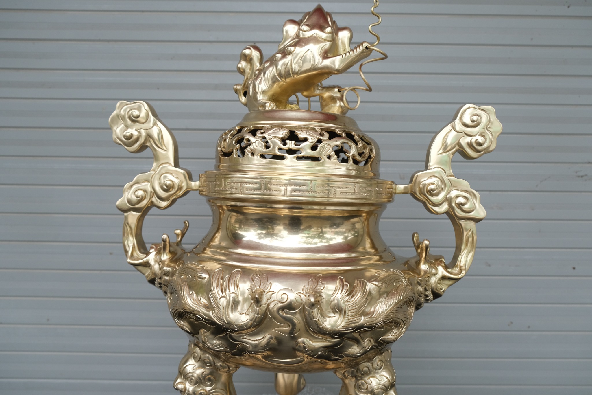 • Họa tiết trên đỉnh đồng, hạc, chân nến đều được thúc tay thủ công, không qua bất kì máy móc nào. Họa tiết được chạm trổ sắc nét, thúc nổi hoàn toàn trên bề mặt. Hình ảnh con nghê trên nắp đỉnh được đúc liền luôn với nắp đỉnh. Đây là một trong những đặc điểm rất quan trọng khi lựa chọn bộ ngũ sự đổng đỏ mộc.