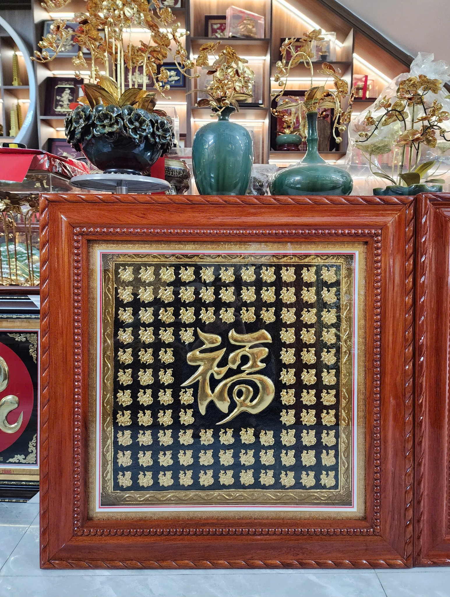 - Khung tranh được làm bằng gỗ hương đá, có kính và đèn led