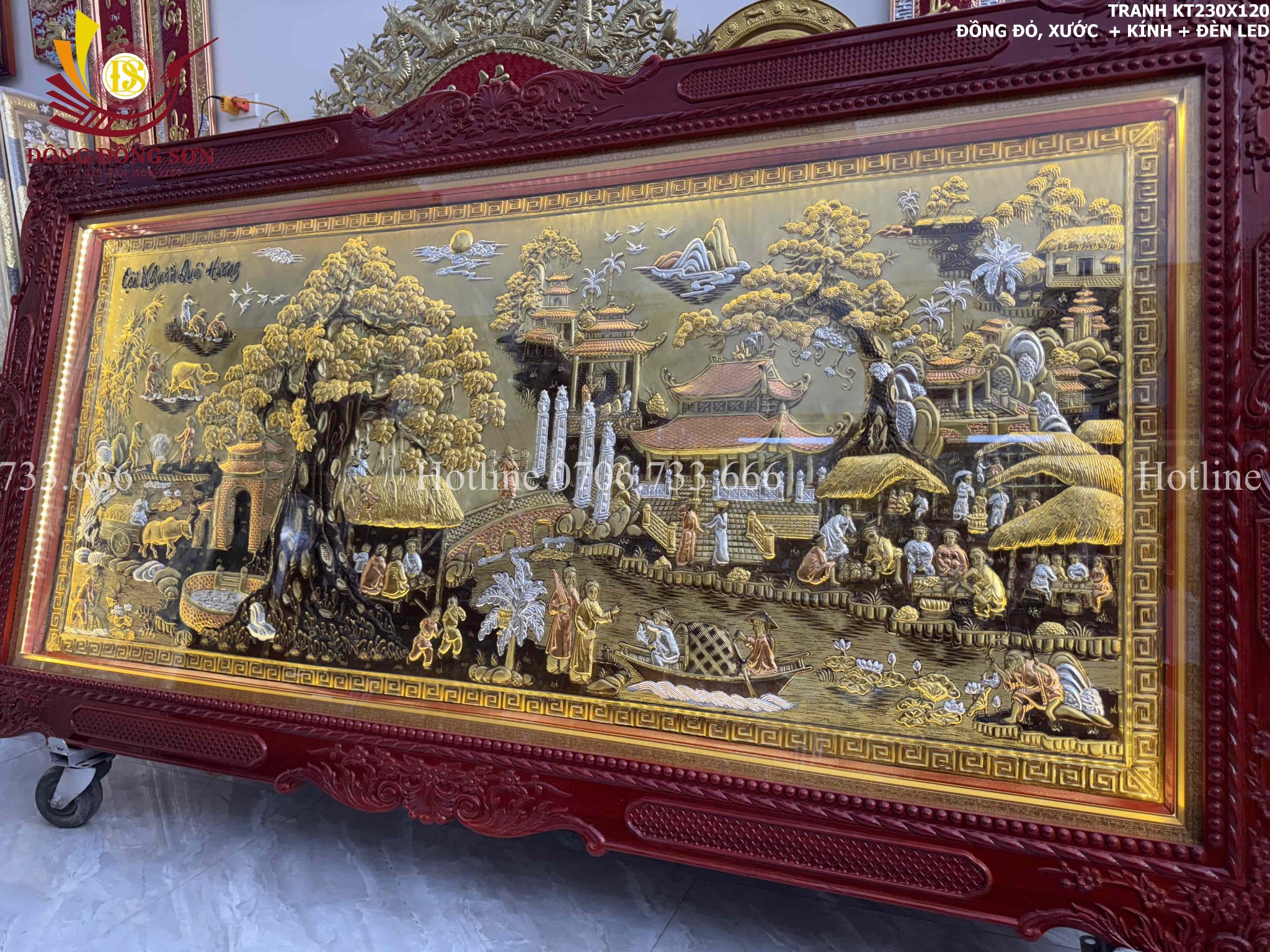 | Quy cách | - Khung gỗ Sồi Nga, khung gỗ chắc chắn đảm bảo không cong vênh, mối mọt - Tranh có kính và đèn led bên trong. Tạo cho bức tranh trở nên sống động và có hồn hơn. - Hàng thúc tay thủ công, hoa văn sắc nét, mềm mại tạo cho bức tranh sinh động. - Tranh được dát : vàng, bạc, đồng đỏ |
