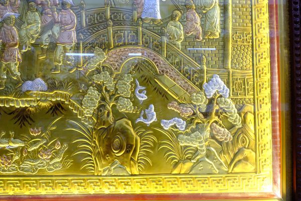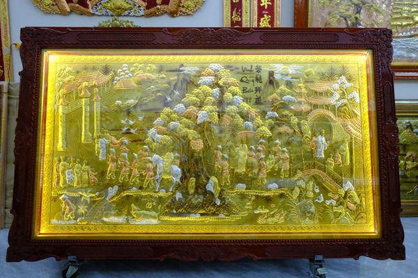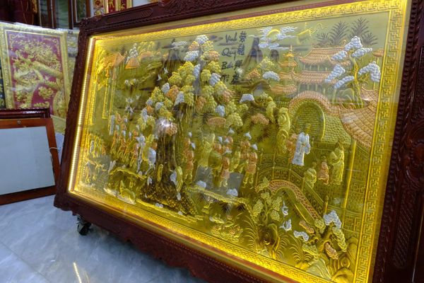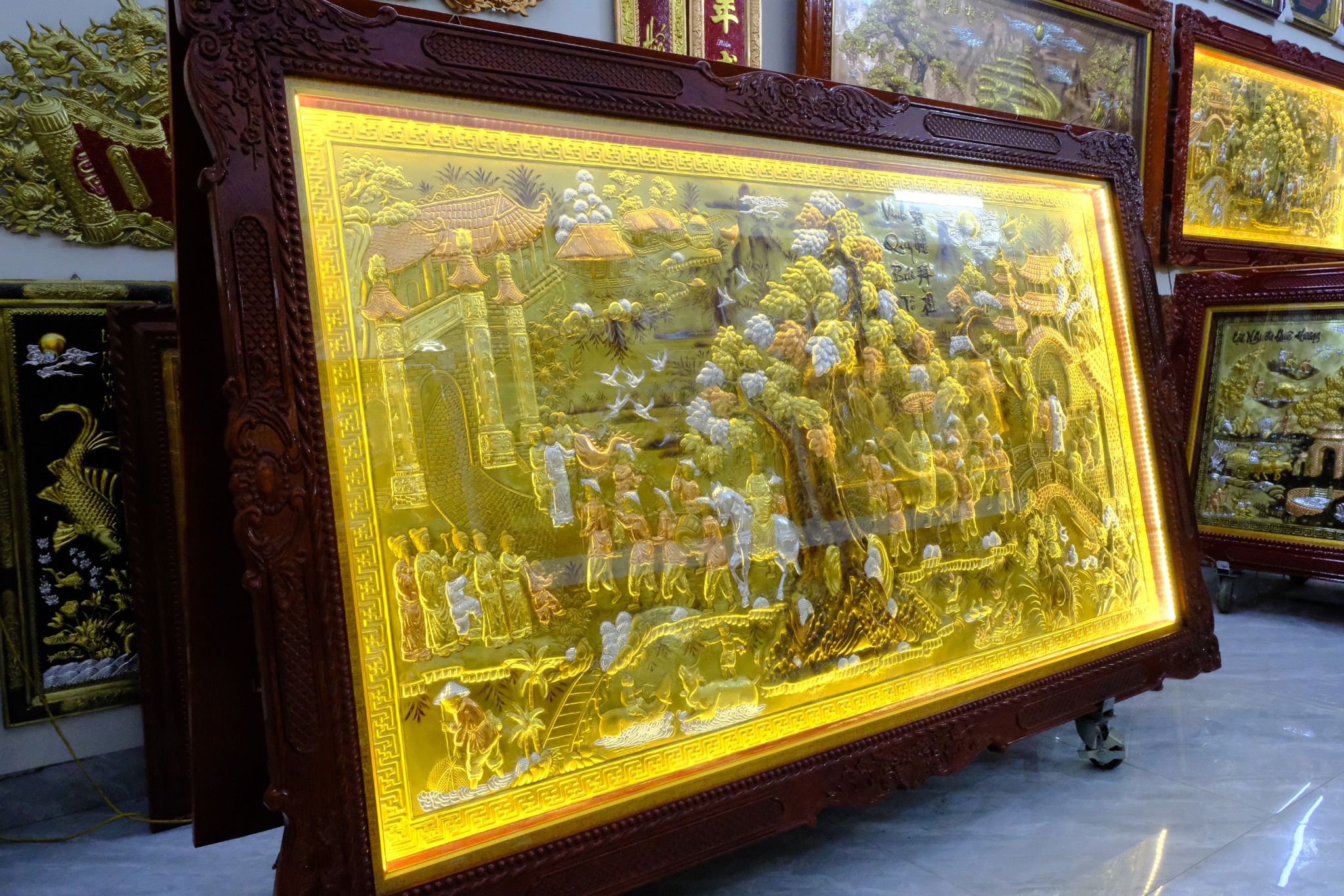 | Chất liệu | - Khung gỗ sồi đục hoa tây - Tranh được làm bằng đồng vàng nguyên tấm |