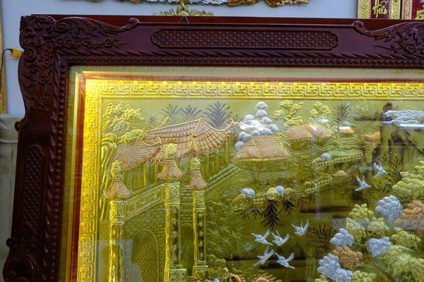 | Quy cách | - Khung gỗ sồi, khung gỗ chắc chắn đảm bảo không cong vênh, mối mọt - Tranh có kính và đèn led bên trong. Tạo cho bức tranh trở nên sống động và có hồn hơn. - Hàng thúc tay thủ công, hoa văn sắc nét, mềm mại tạo cho bức tranh sinh động. - Tranh được dát vàng khung |