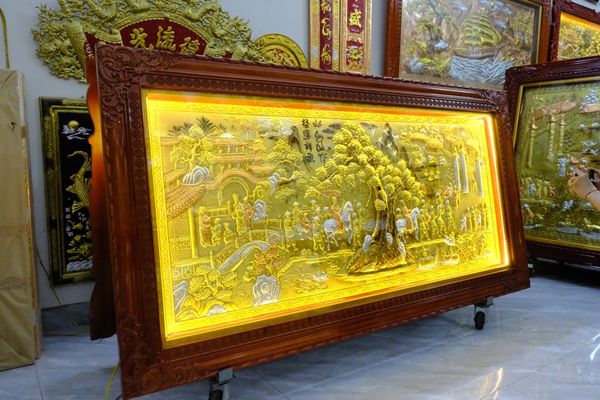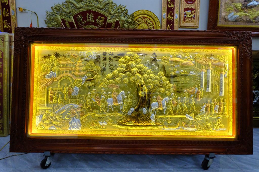 | Quy cách | - Khung gỗ sồi, khung gỗ chắc chắn đảm bảo không cong vênh, mối mọt - Tranh có kính và đèn led bên trong. Tạo cho bức tranh trở nên sống động và có hồn hơn. - Hàng thúc tay thủ công, hoa văn sắc nét, mềm mại tạo cho bức tranh sinh động. - Tranh được dát vàng khung |
