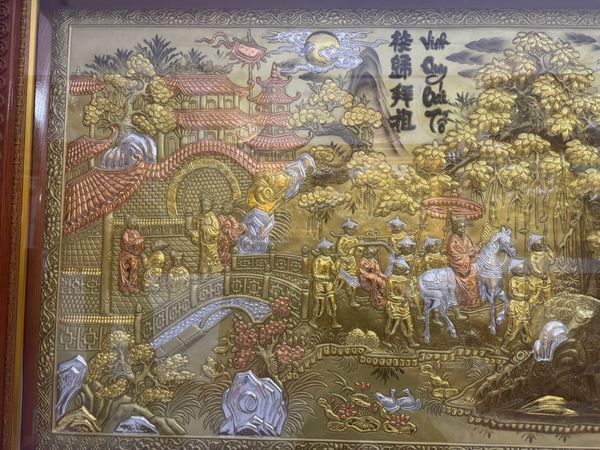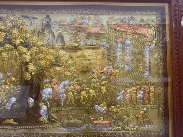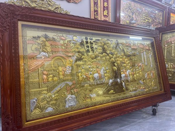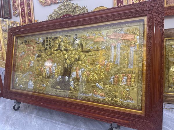 | Chất liệu | - Khung gỗ sồi đục hoa tây - Tranh được làm bằng đồng vàng nguyên tấm |