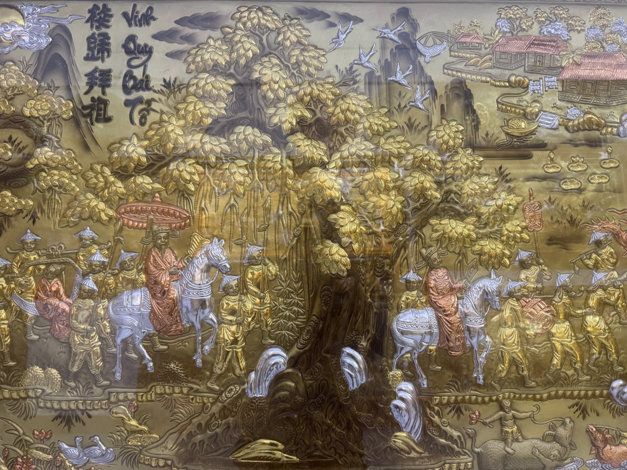 • Tranh đồng vinh quy bái tổ được người nghệ nhân chạm khắc bằng tay tỉ mỉ đến từng chi tiết. Bề mặt còn được phủ bóng để giữ cho màu sắc của tranh được bền hơn. Hơn thế, bên ngoài còn được phú một lớp kính để tránh cho tấm đồng tiếp xúc với không khí bên ngoài, để tăng thêm độ bền cho bức tranh.