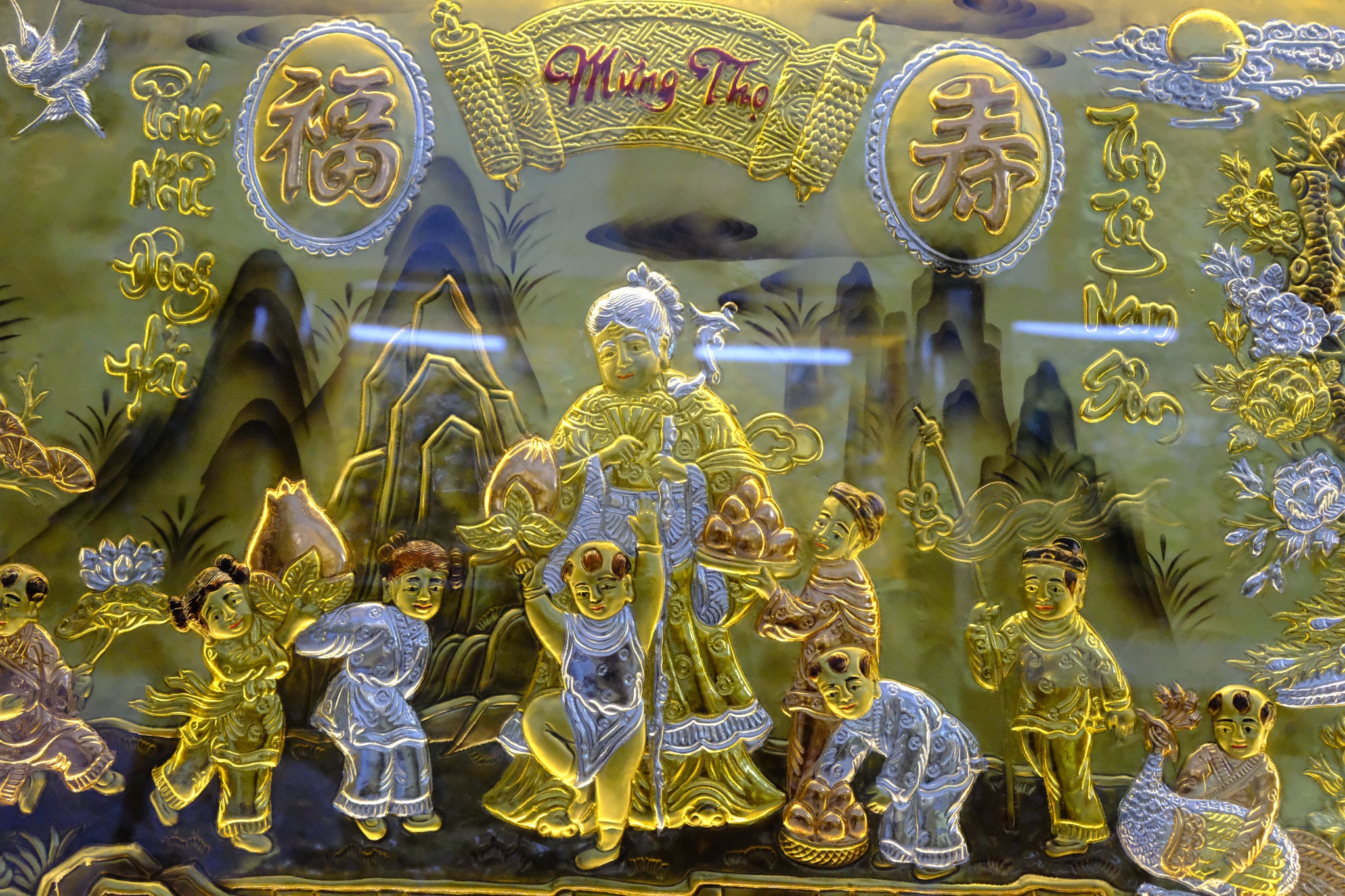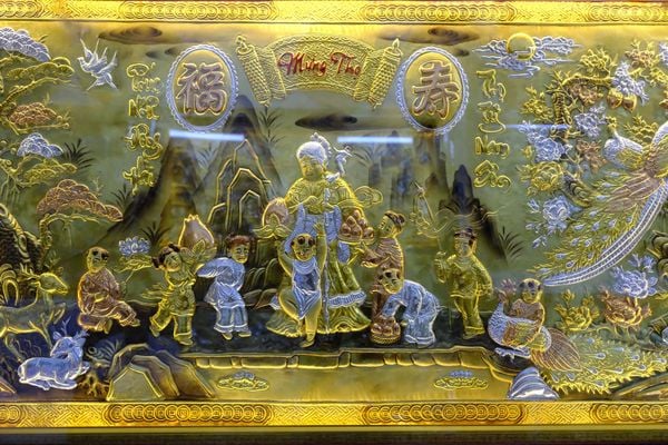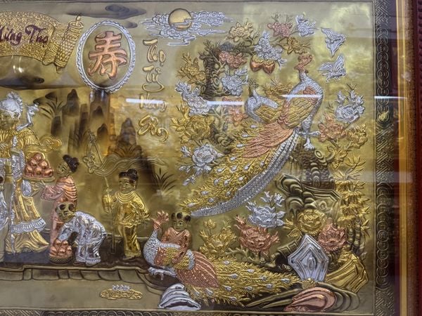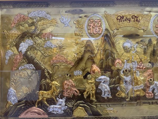 Hay những bức tranh đồng có đôi câu đối quen thuộc như “Phúc như Đông Hải – Thọ tỉ Nam Sơn”. “Phúc” ở đây là điều may mắn, tốt lành, “Thọ” là sống lâu sống thọ, được ví với nước biển Đông và trúc ở rừng Nam Sơn trường tồn và nhiều vô kể. Thông thường, mỗi bức tranh đồng đều có hai chữ “Mừng Thọ” được viết bằng chữ quốc ngữ với lối thư pháp bay bổng, phóng khoáng đặt ở giữa trên cùng rất cân đối và trịnh trọng.
