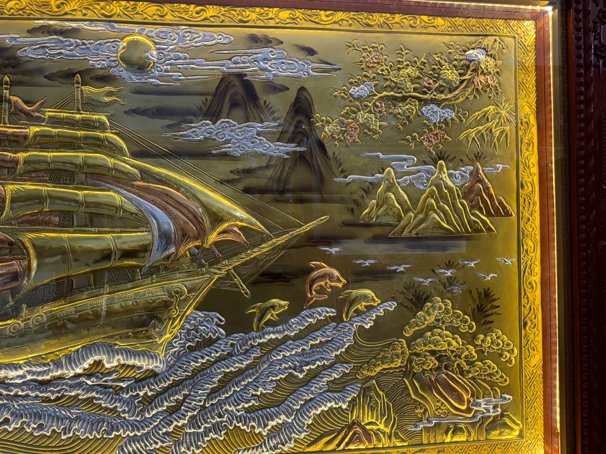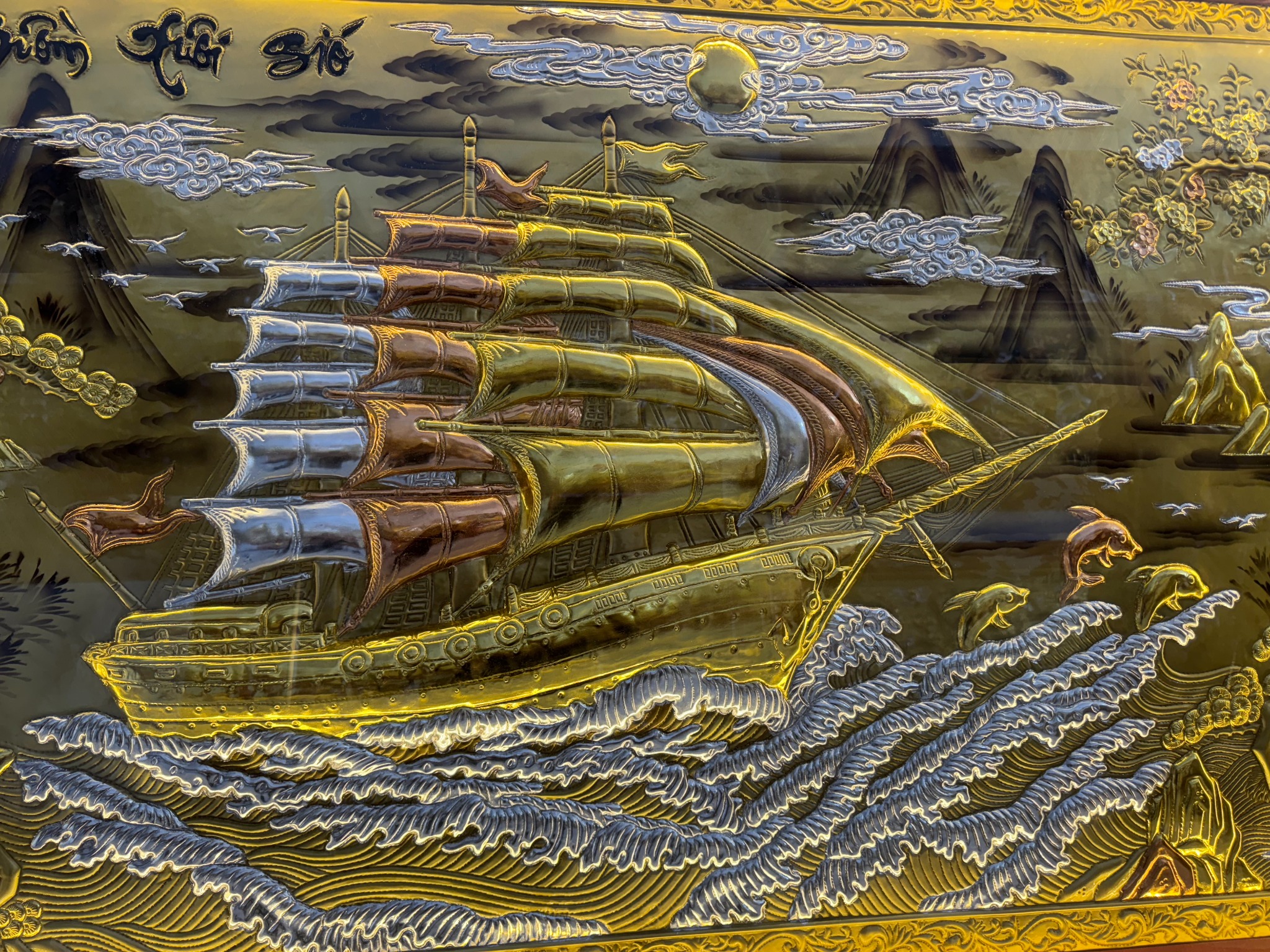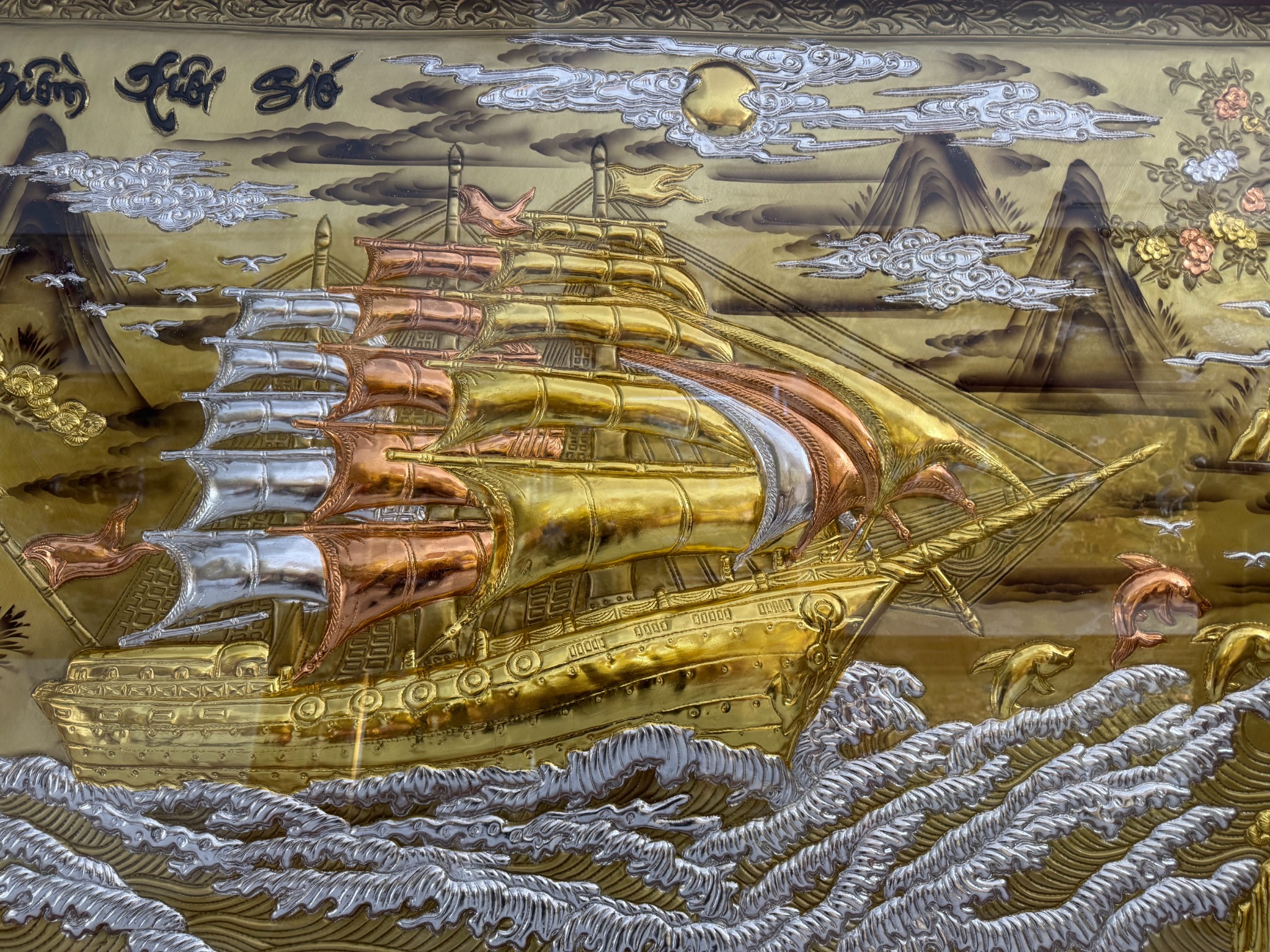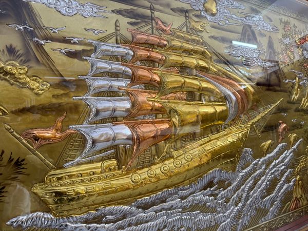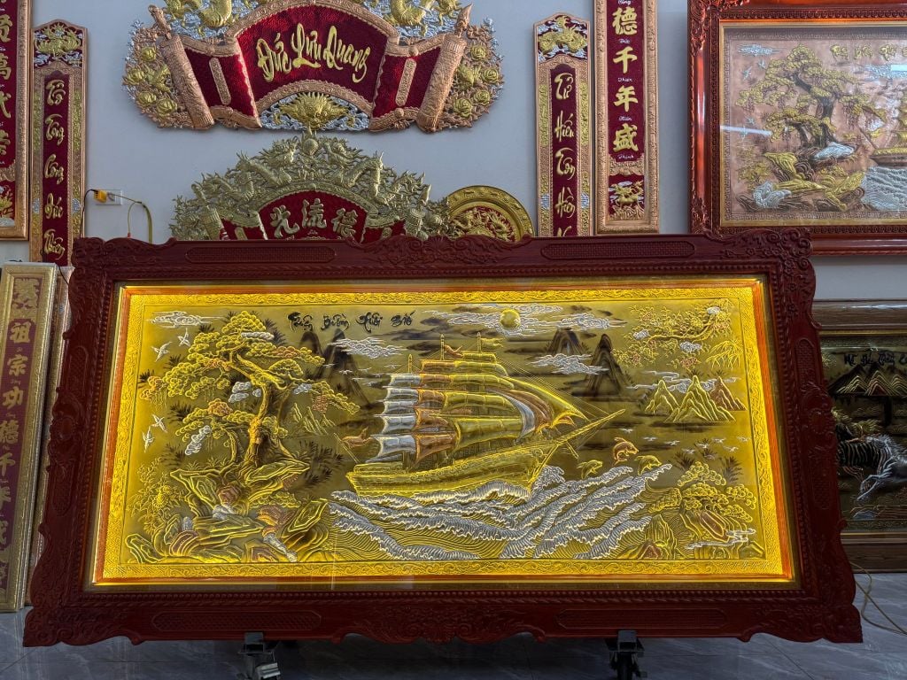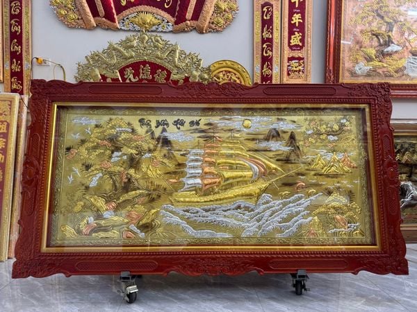| Quy cách | - Khung tranh được làm bằng gỗ chắc chắn - Nền tranh được làm bằng đồng đỏ dát vàng, dát bạc, dát đồng - Hàng thúc tay thủ công, hoa văn sắc nét, mềm mại tạo cho bức tranh sinh động |
