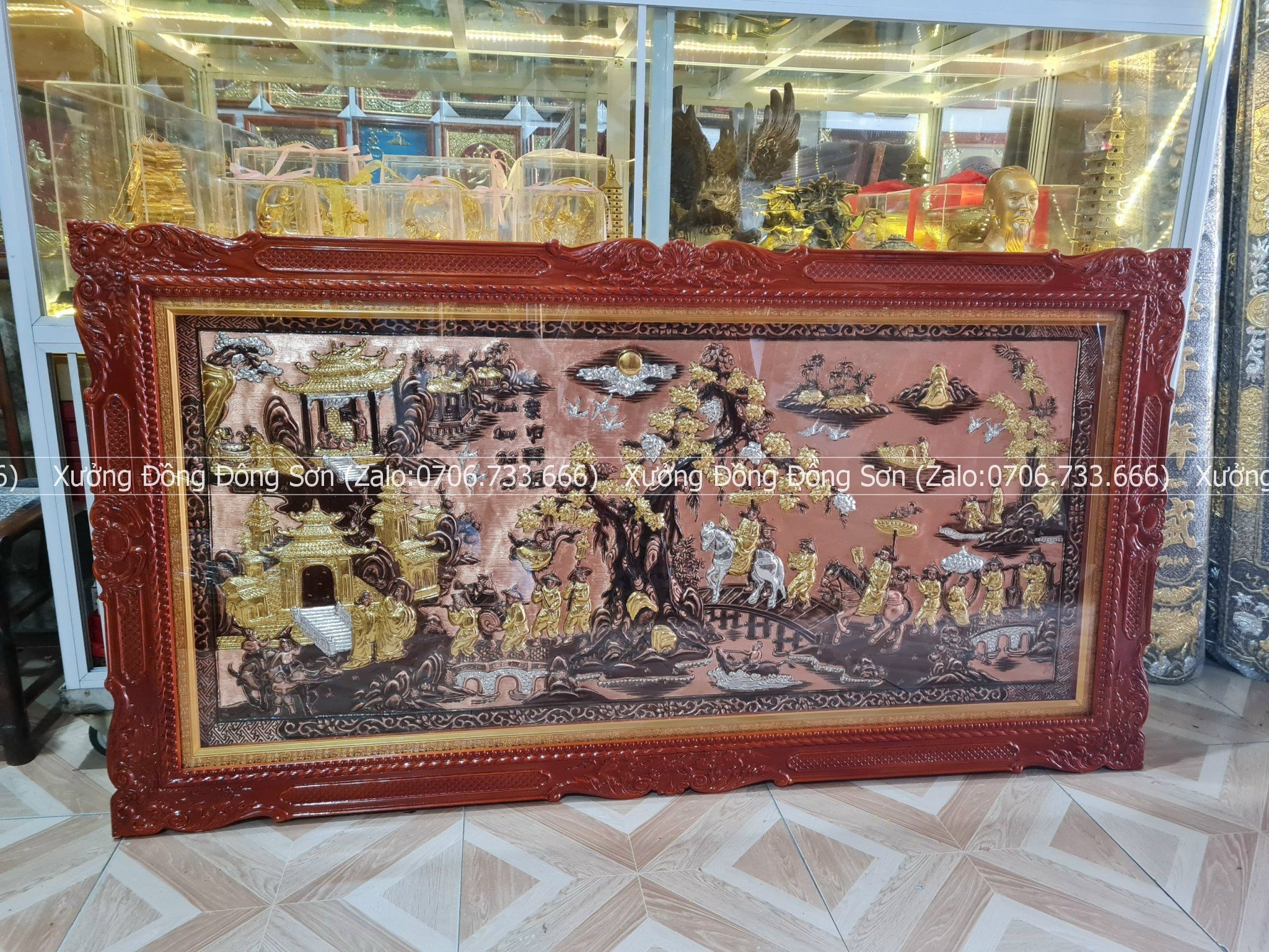 | Màu sắc | - Màu tấm đồng được dát vàng bạc - Khung gỗ làm theo màu sắc yêu cầu |