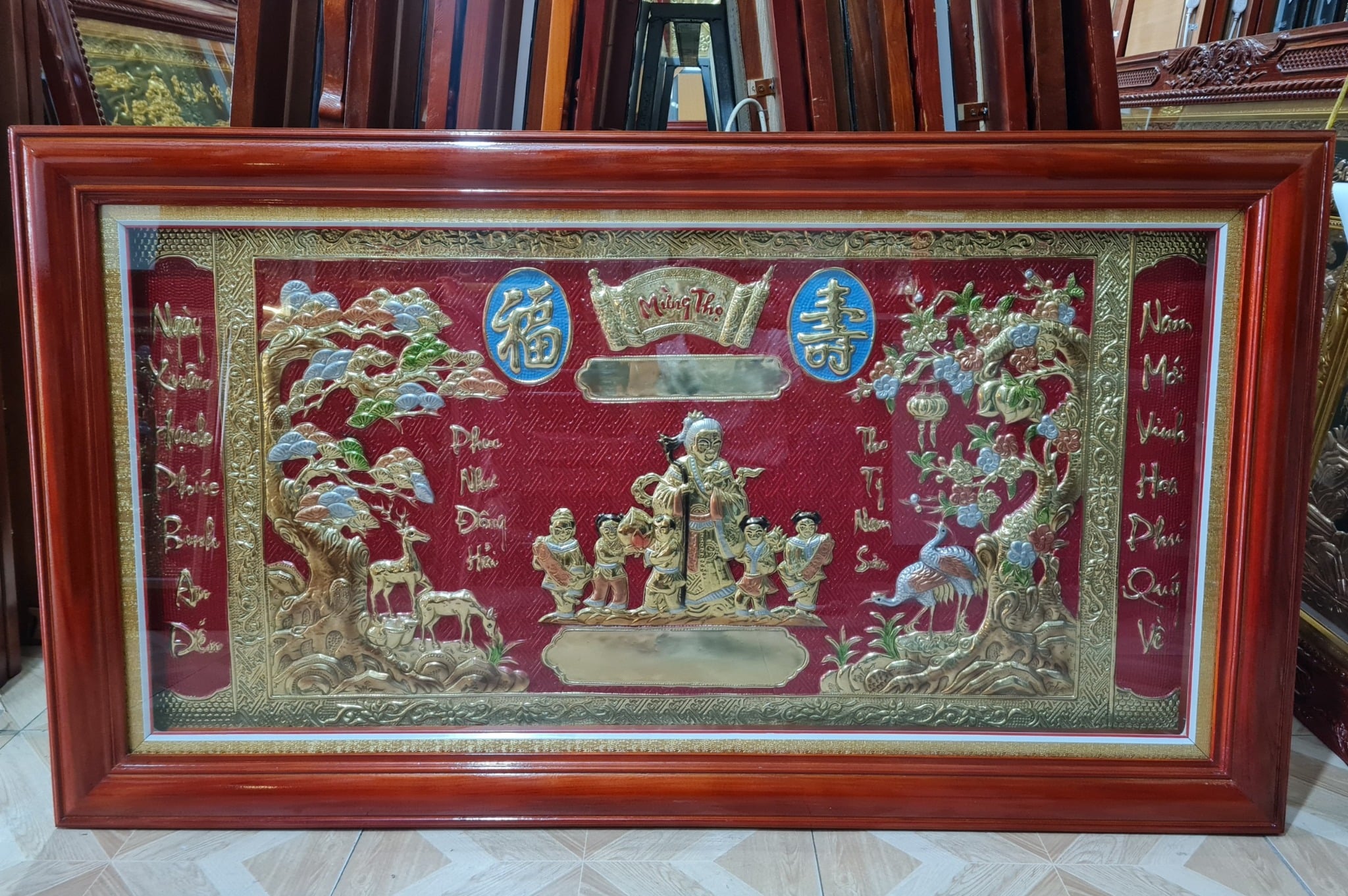 | Màu sắc | - Màu tấm đồng nền đỏ - Khung gỗ làm theo màu sắc yêu cầu |