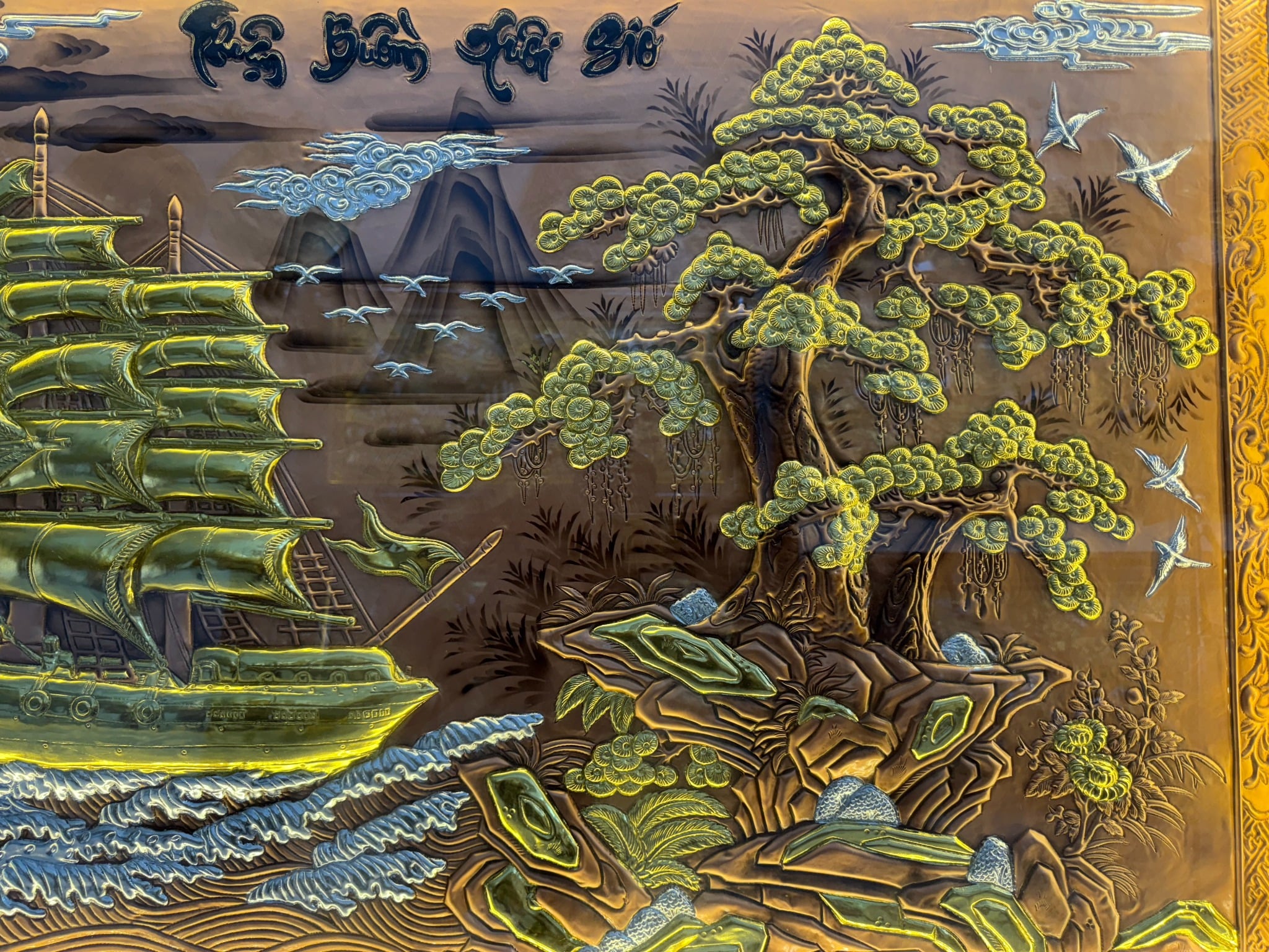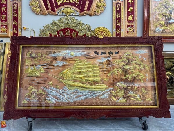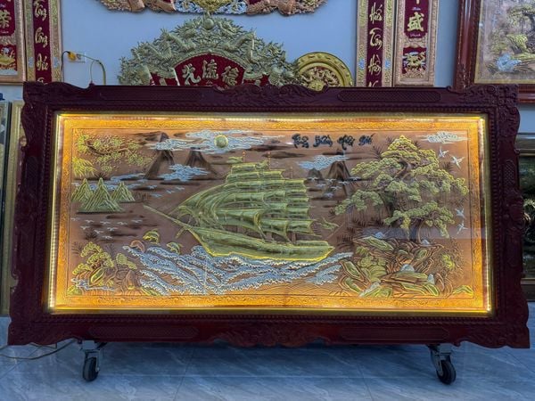 | Quy cách | - Khung tranh được làm bằng gỗ chắc chắn - Nền tranh được làm bằng đồng đỏ dát vàng, dát bạc, dát đồng - Hàng thúc tay thủ công, hoa văn sắc nét, mềm mại tạo cho bức tranh sinh động |