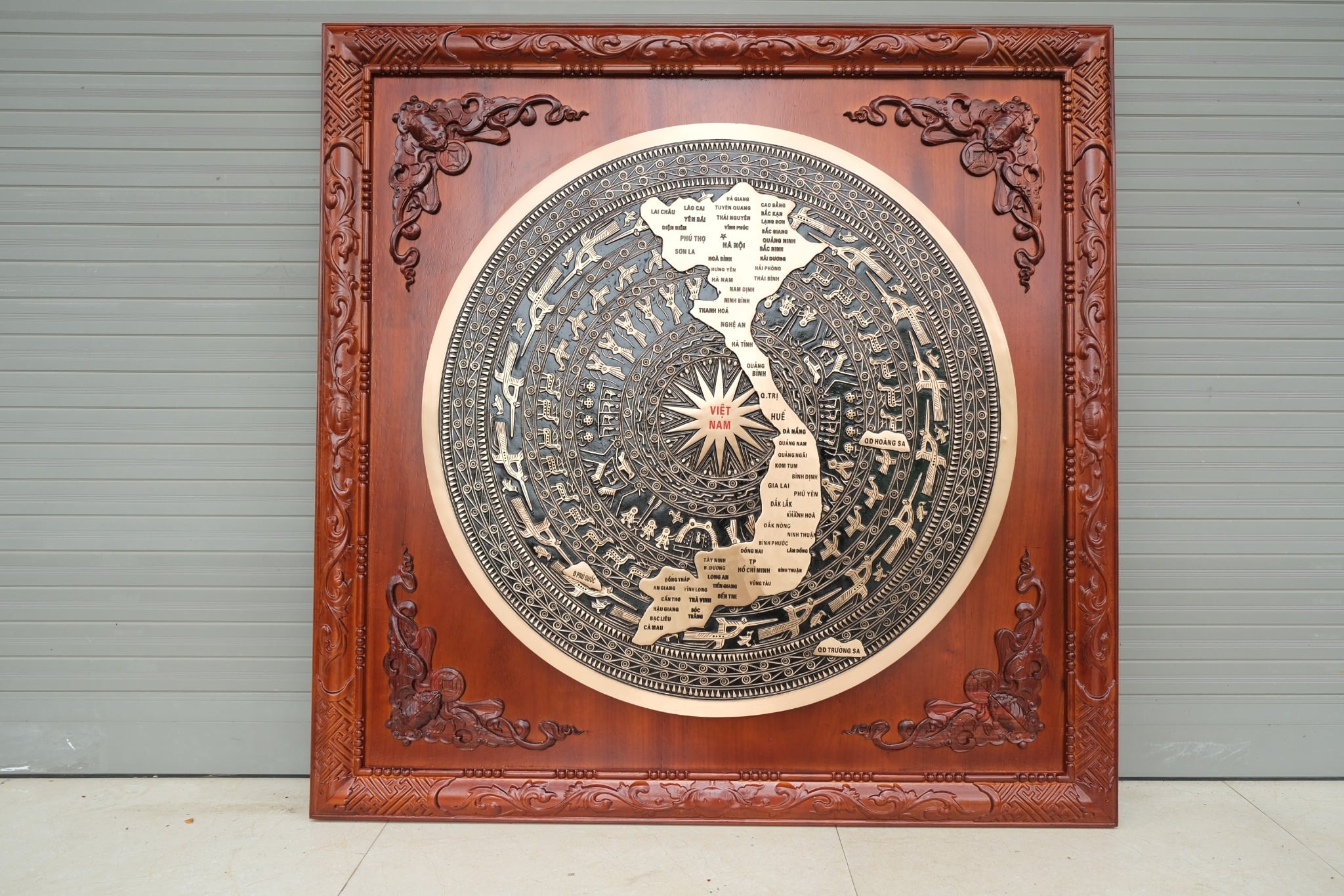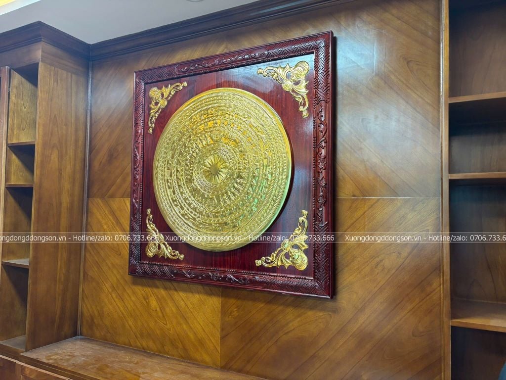 | Quy cách | - Khung tranh làm bằng gỗ hương đỏ - Bo góc dơi ngậm tiền dát vàng liên khung gỗ - Mặt trống được làm bằng đồng đỏ đúc thủ công, hàng liền khối. - Bảo hành 10 năm |