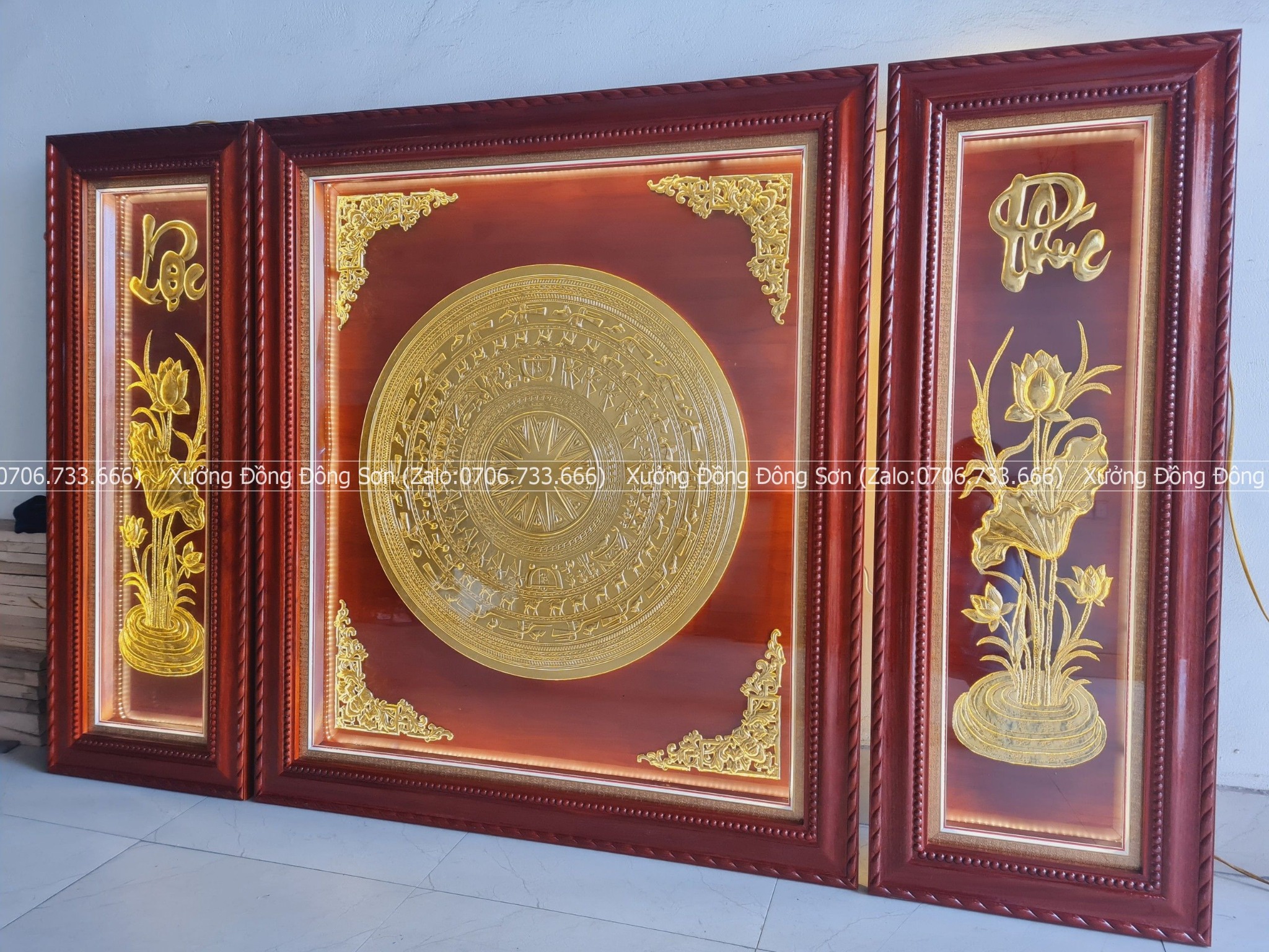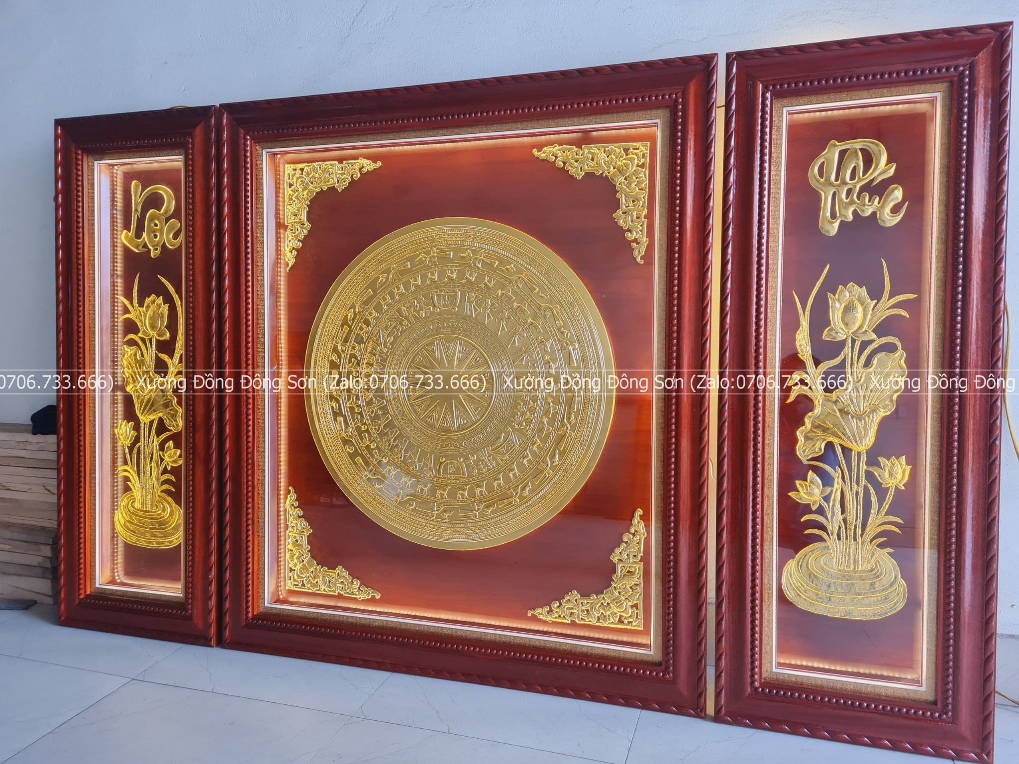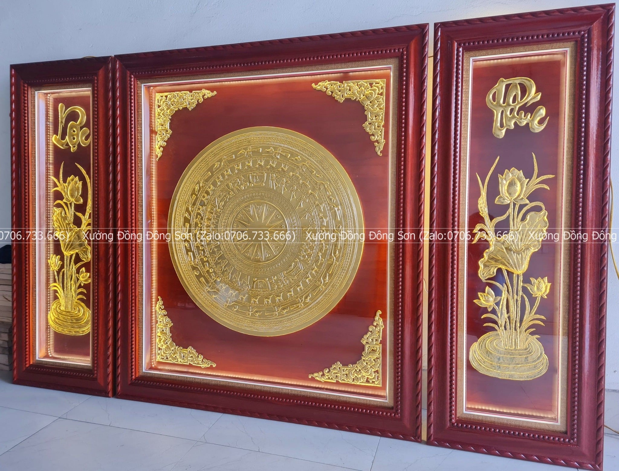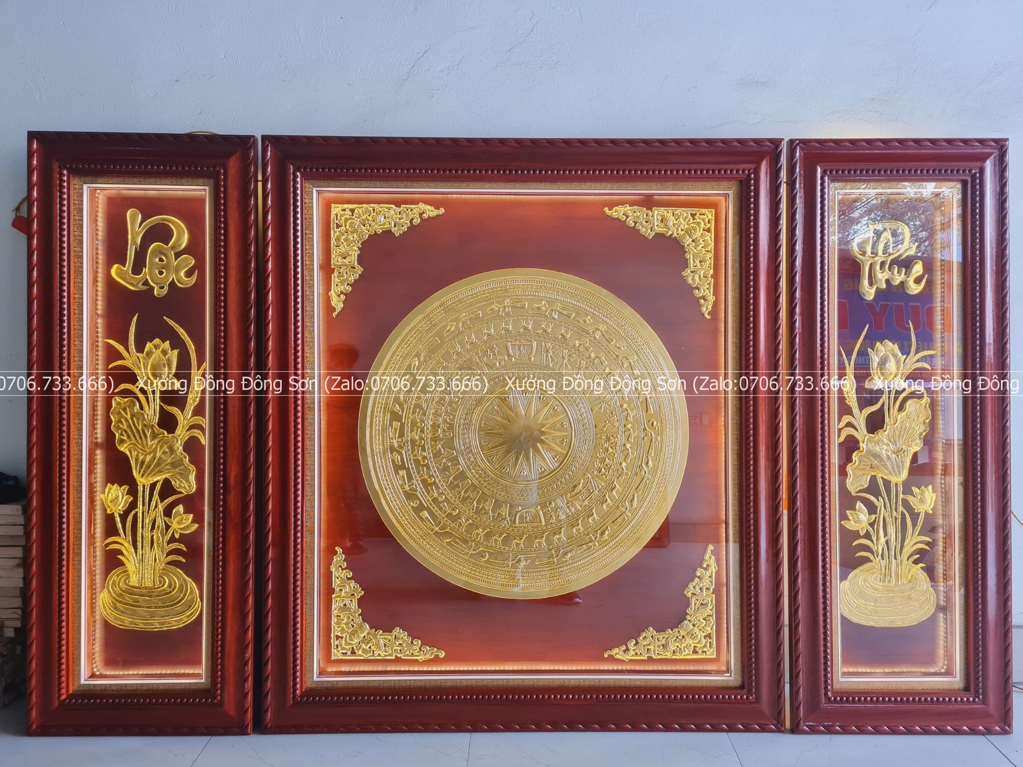 | Quy cách | - Khung gỗ sồi Nga sắc nét. Gỗ chuẩn, không cong vênh, không mối mọt, không mắt gỗ - Tranh có mặt kính, đèn led bên trong - Mặt trống và bình sen được làm bằng đồng. Đường kính mặt trống 80cm |