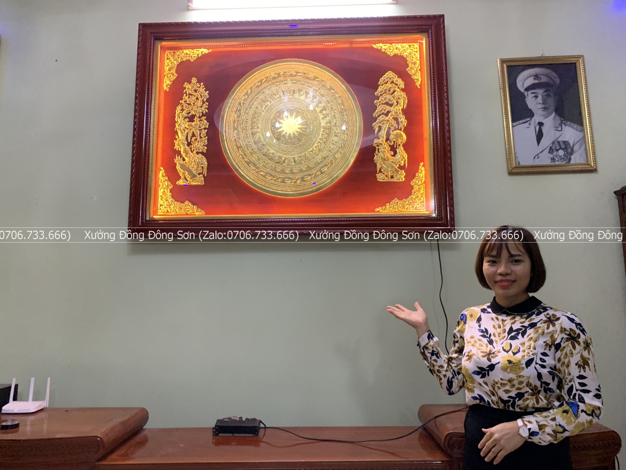 | Quy cách | - Khung gỗ sồi Nga sắc nét. Gỗ chuẩn, không cong vênh, không mối mọt, không mắt gỗ. - Tranh có mặt kính, đèn led bên trong. Kích thước phủ bì khung gỗ là 175*125 cm - Mặt trống đường kính 80cm, hai cây hai bên được dát vàng 18k |