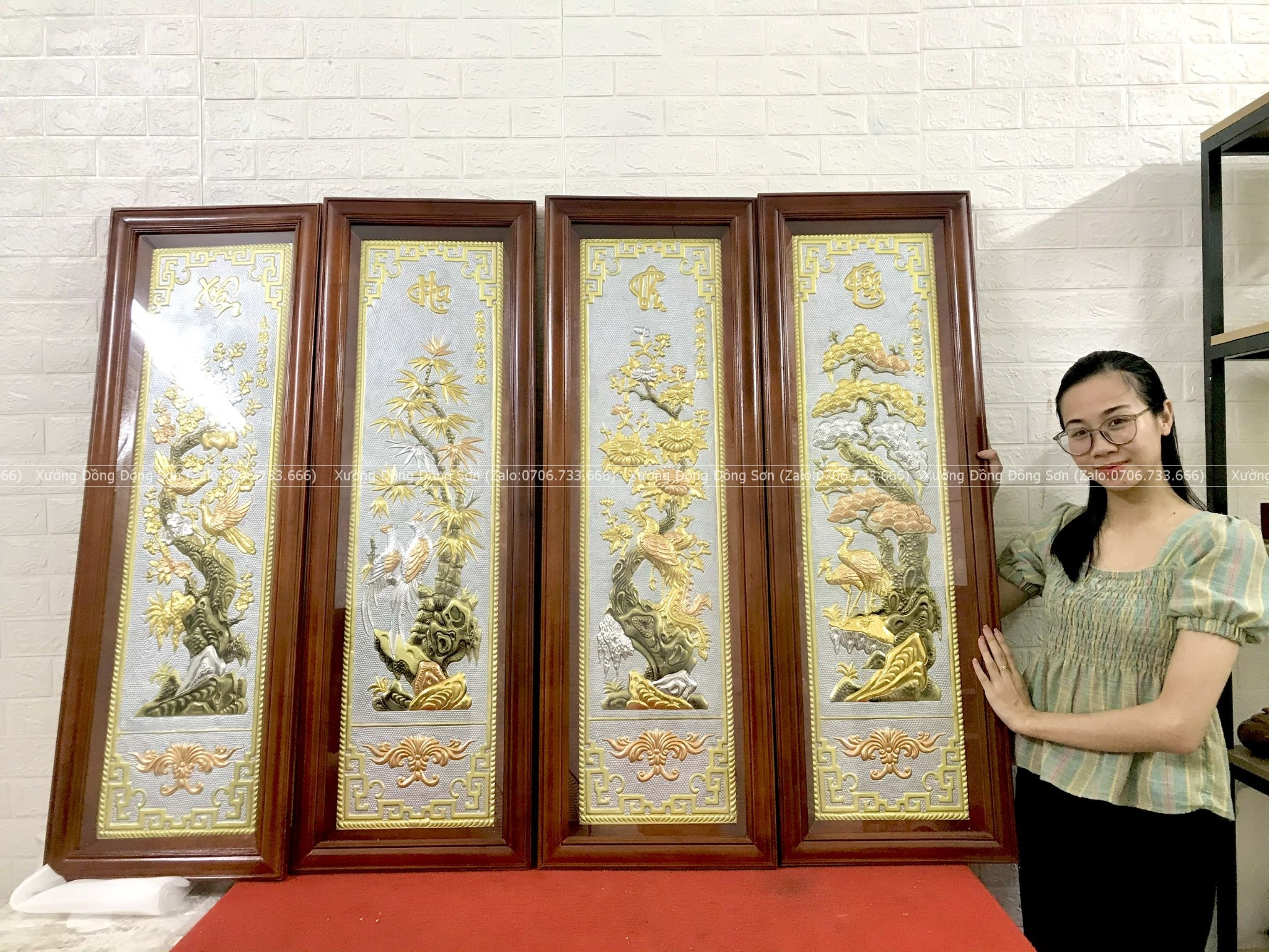 • Nhắc đến tranh tứ quý bằng đồng thì người ta nghĩ ngay đến bốn mùa trong năm đó là Xuân - Hạ - Thu- Đông. Tranh tứ quý bằng đồng chính là loại tranh theo bộ, chúng sẽ bao gồm 4 bức. Mỗi bức tranh là một loài cây, loài hoa quý đại diện cho một mùa trong năm. Ví như: