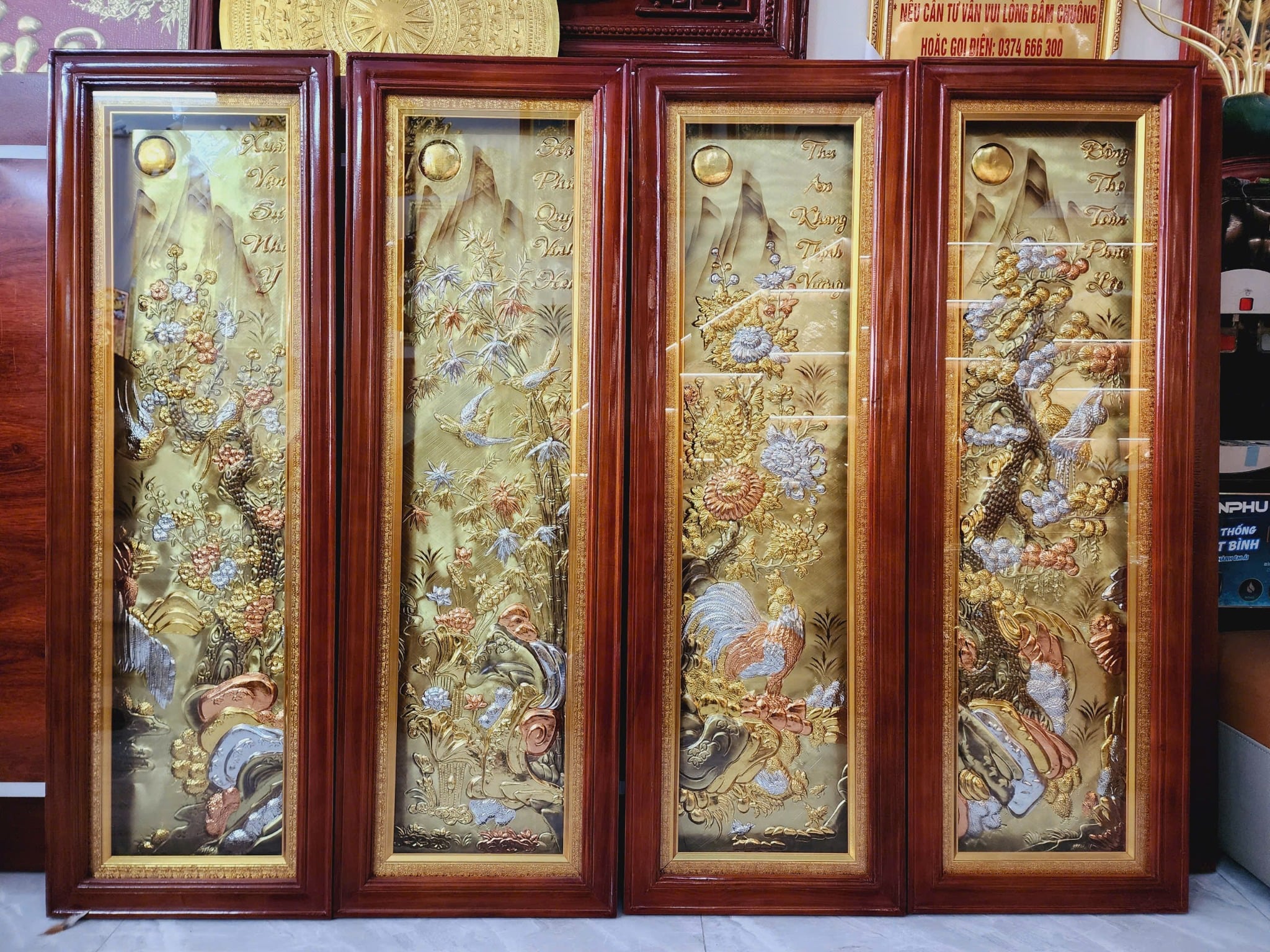 • Nhắc đến tranh tứ quý bằng đồng thì người ta nghĩ ngay đến bốn mùa trong năm đó là Xuân - Hạ - Thu- Đông. Tranh tứ quý bằng đồng chính là loại tranh theo bộ, chúng sẽ bao gồm 4 bức. Mỗi bức tranh là một loài cây, loài hoa quý đại diện cho một mùa trong năm. Ví như: